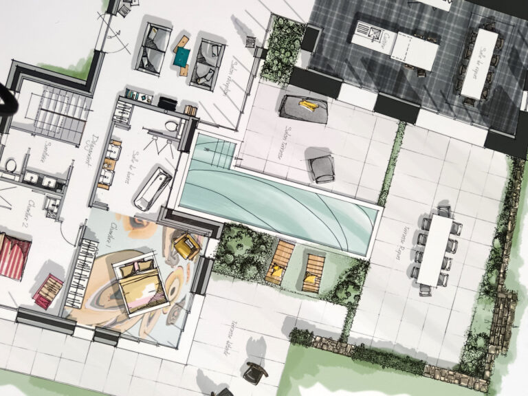 Une approche sensible de l’architecture d’intérieur, entre esquisse à la main et conception sur mesure.
